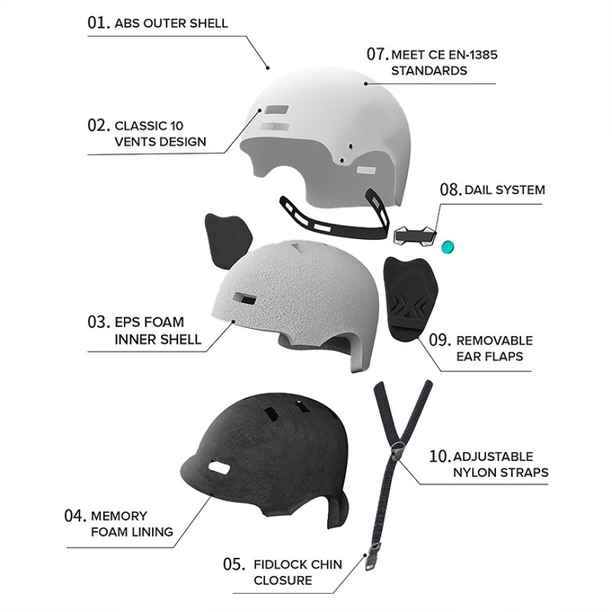 This ice skating helmet is designed for skateboarding, rollerblading, and extreme sports. It features a high-strength ABS shell and EPS foam lining, making it lightweight, durable, and providing robust protection. The helmet includes detachable earcups, 10 ventilation vents, adjustable shoulder straps, and a quick-release chin strap to ensure both comfort and safety.